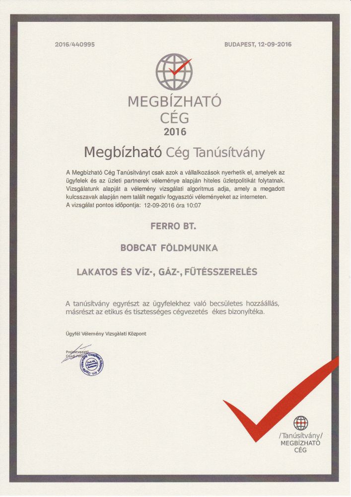 Cégünk 2016-ban elnyerte a megbízható cég tanúsítványt